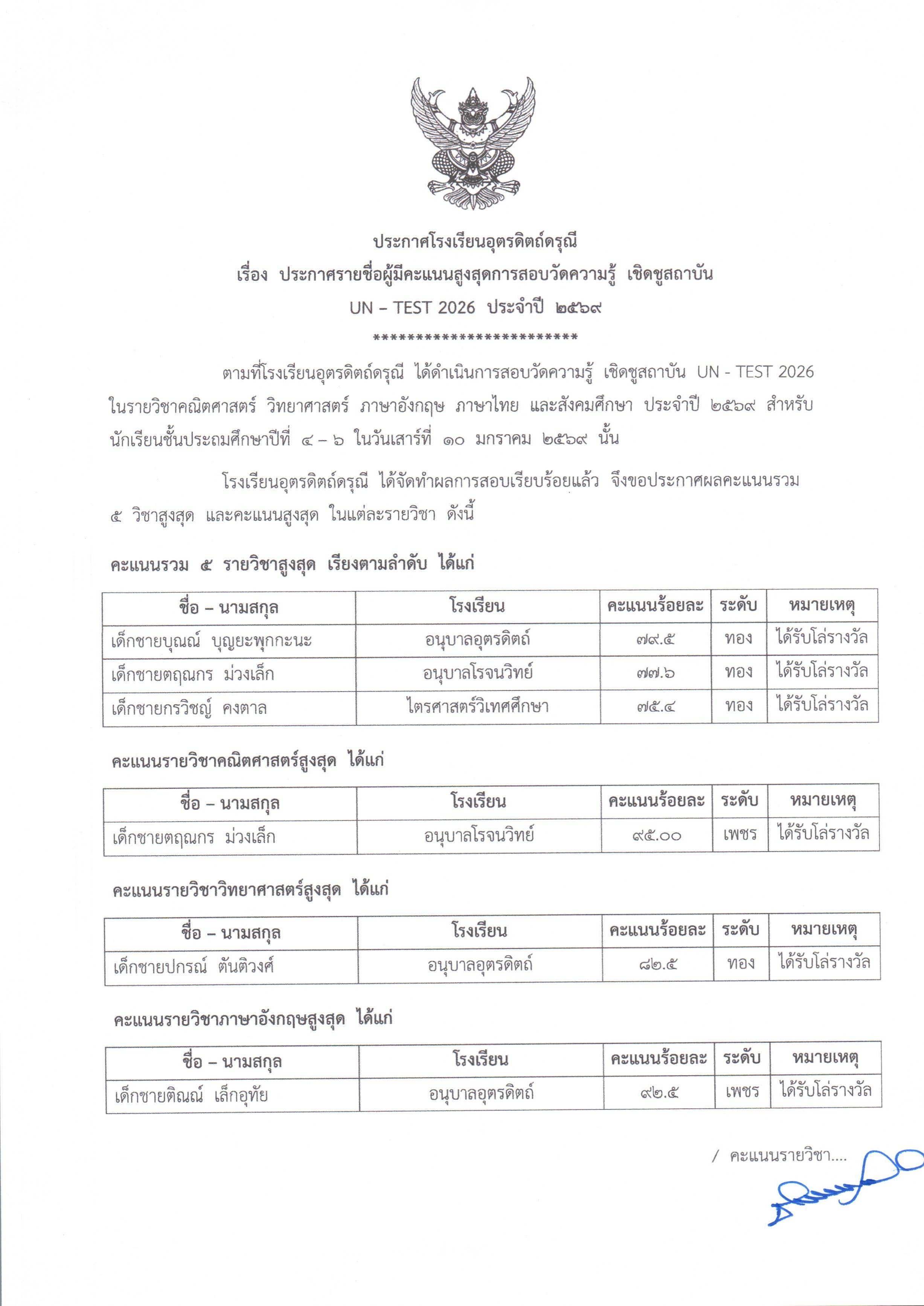 ประกาศผลคะแนนการทดสอบ UN-TEST 2026 รายบุคคล